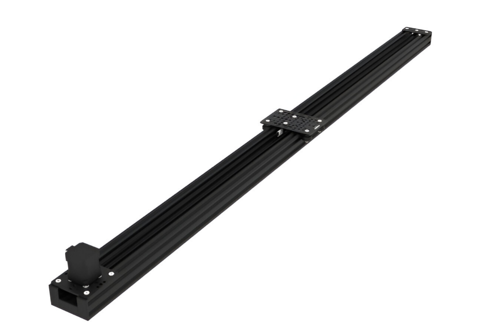 Esse conjunto utiliza o perfil C-beam como base para fazer a movimentação através de correias, utilizando placa com roldanas