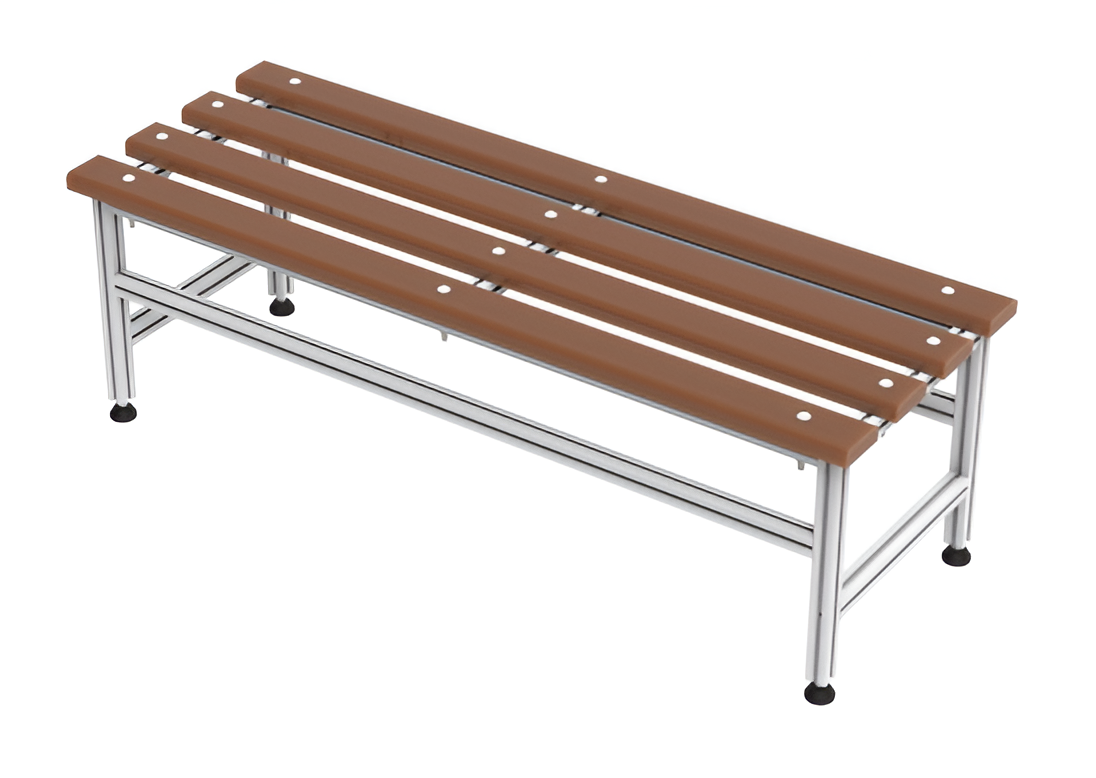 Este banco é feito com uma estrutura de perfil de alumínio anodizado e possui assento em madeira, unindo durabilidade com um toque natural e estético. Suas dimensões são 405,40 mm de altura, 446,20 mm de largura e 1245 mm de comprimento, proporcionando uma superfície confortável e espaçosa. Os pés de apoio, que podem ser de borracha ou nylon, contam com ajuste de nível, permitindo adaptar o banco a pisos irregulares e garantindo estabilidade adicional. Este design é versátil e aplicável em diversos ambientes.